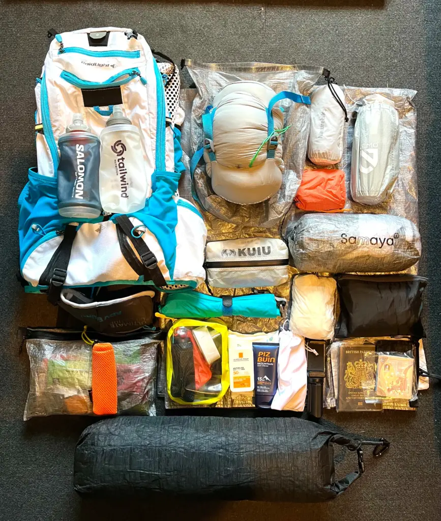 The pack is the Raidlight Ultra Legend 20. This is simply the best medium capacity running pack that I have come across. My kit overall would significantly stretch the capacity of the backpack alone, so I repeated what I did on the GR70 fastpack back in 2024 and strapped a long drybag to the bottom of the backpack. This works really well, especially if the drybag is used for light items, clothing in particular. This is the exact same set-up I had planned to use on the Highland Ultra next month so no harm in being thoroughly acquainted with it beforehand.