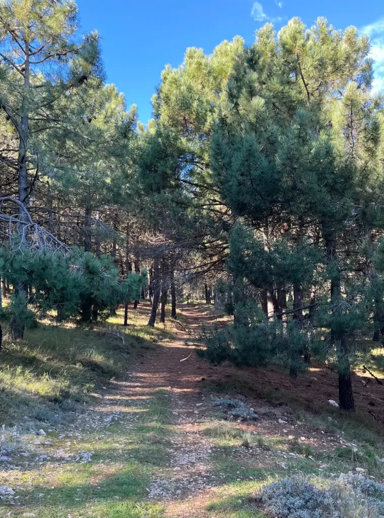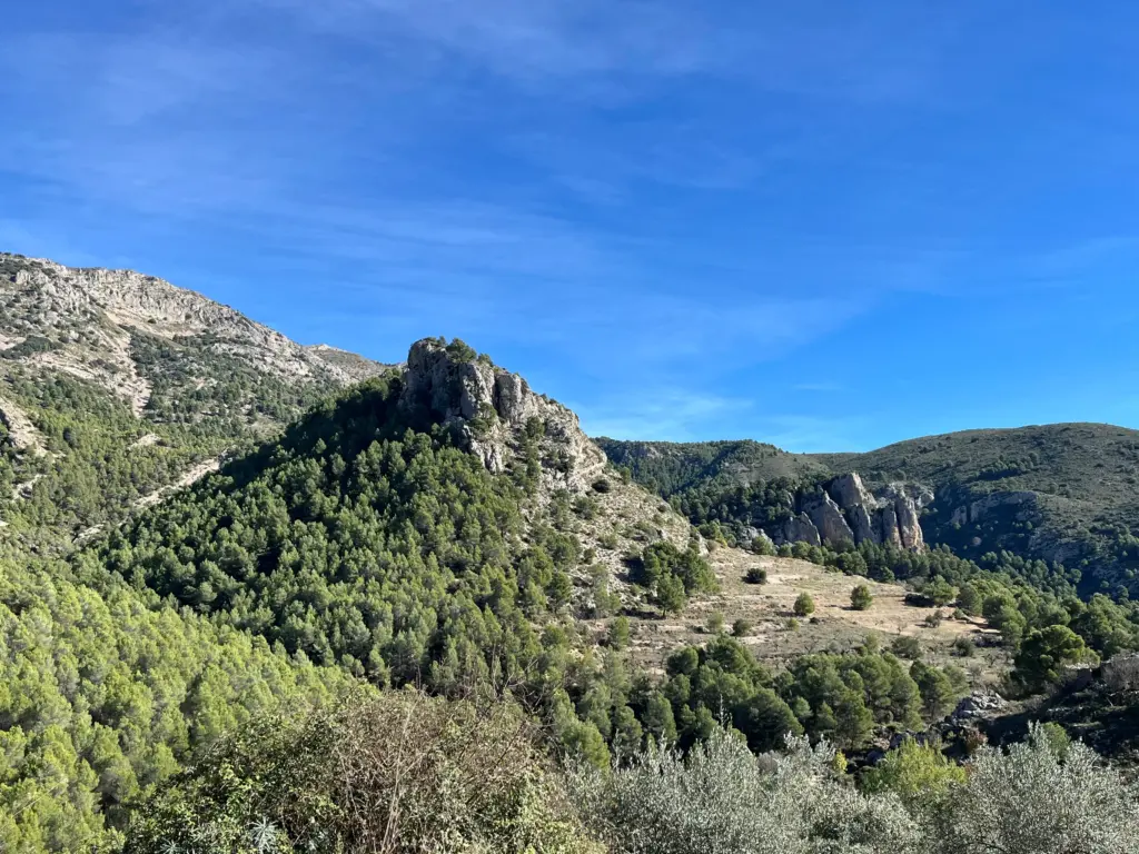 Finally, things started to level off and the path crosses the flatter summit to a high point then cuts back towards the back side of the mountain. The runners had now started to thin out and that allowed a bit more space to find my own rhythm. The path eventually plunged off the back side of Puig Campana and was a very technical, mildly dangerous downhill for about one mile. A little further on, we continued downhill through the trees to the first liquids-only aid station. I topped up my water and continued on without delay.