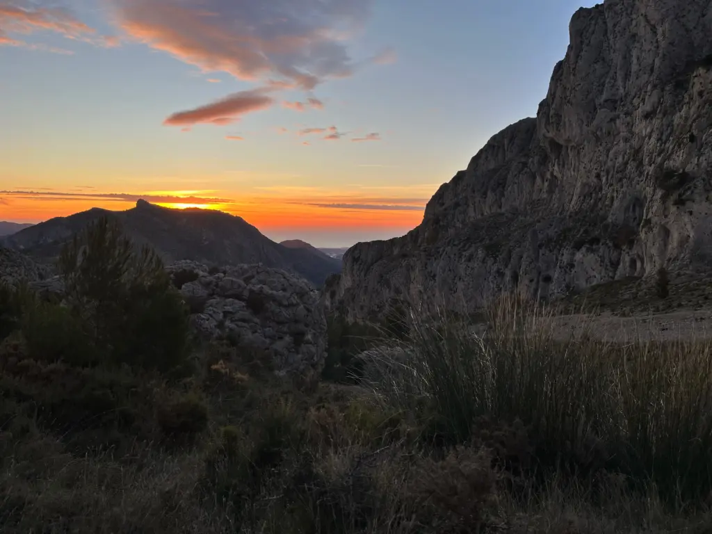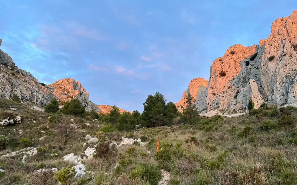 Leaving Benimantell there were a few miles of lower-level running, along olive terraces and alongside waterways. We would have passed the Guadalest reservoir but were blissfully unaware in the darkness, then the second major climb of the race commenced in earnest. This started up the very steep Barranc de les Coves which involved a little scrambling in places. This eventually opened up and levelled off a little as we reached higher ground. The path was easier but still very uneven and rocky so progress was still fairly slow and measured. As I turned west and continued upwards, the very first light of dawn revealed that we were in a long, uphill ravine with steep rocky slopes on either side.
