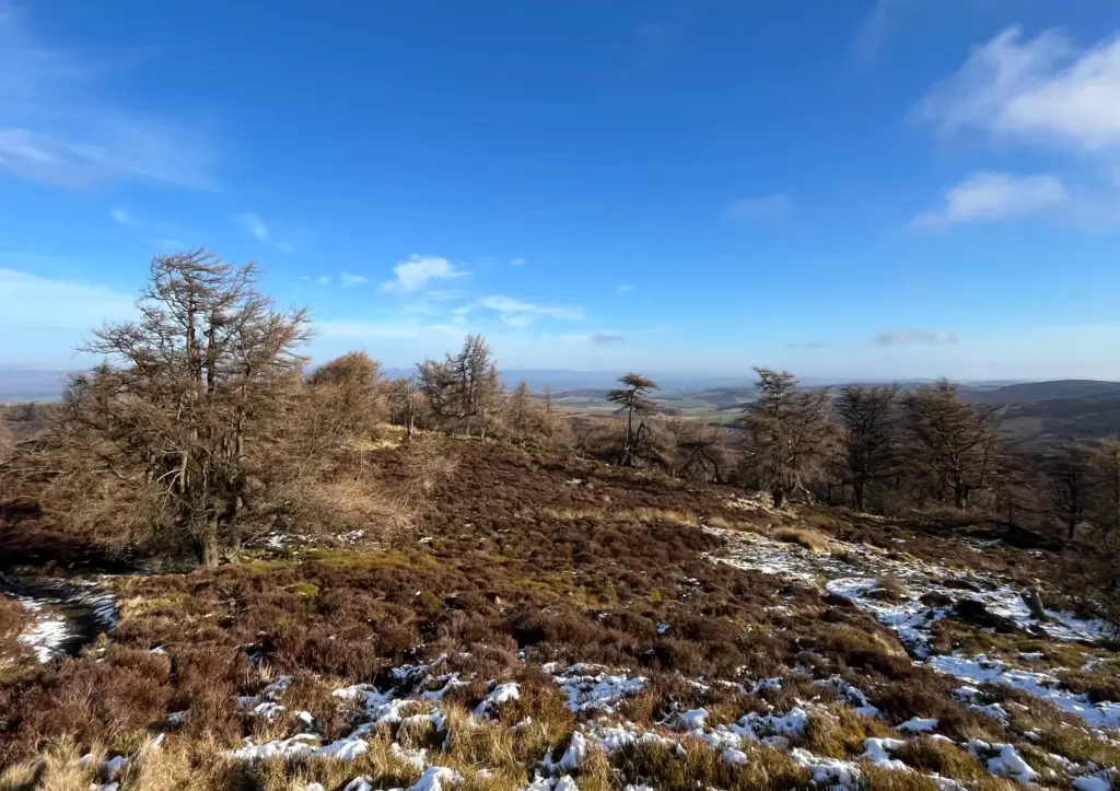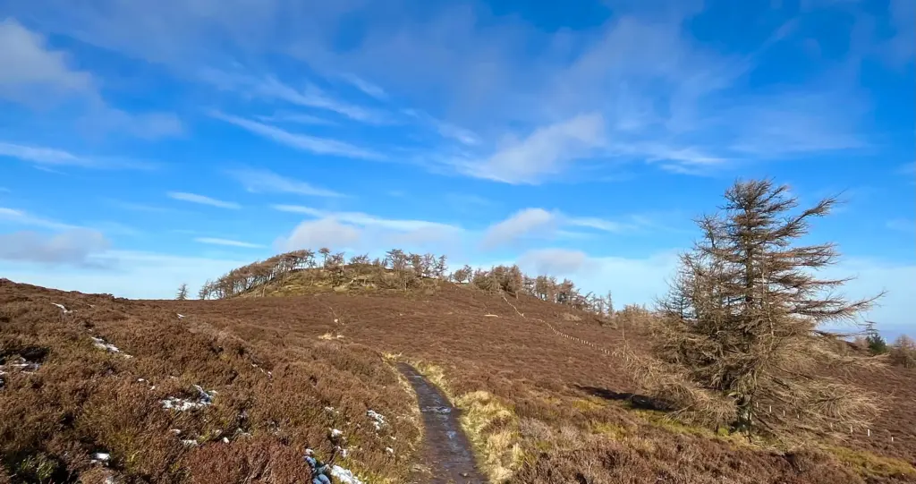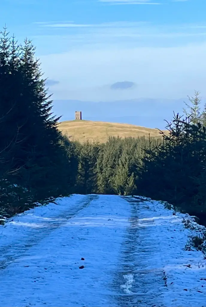 After a descent through the heather, the path improved as I passed the wind turbine, heading down a little more to join the forestry track below. The next mile or so follows the track and much of the track was still covered by snow where the trees had maintained a permanent shade. First clear views of the tower were also to be had.