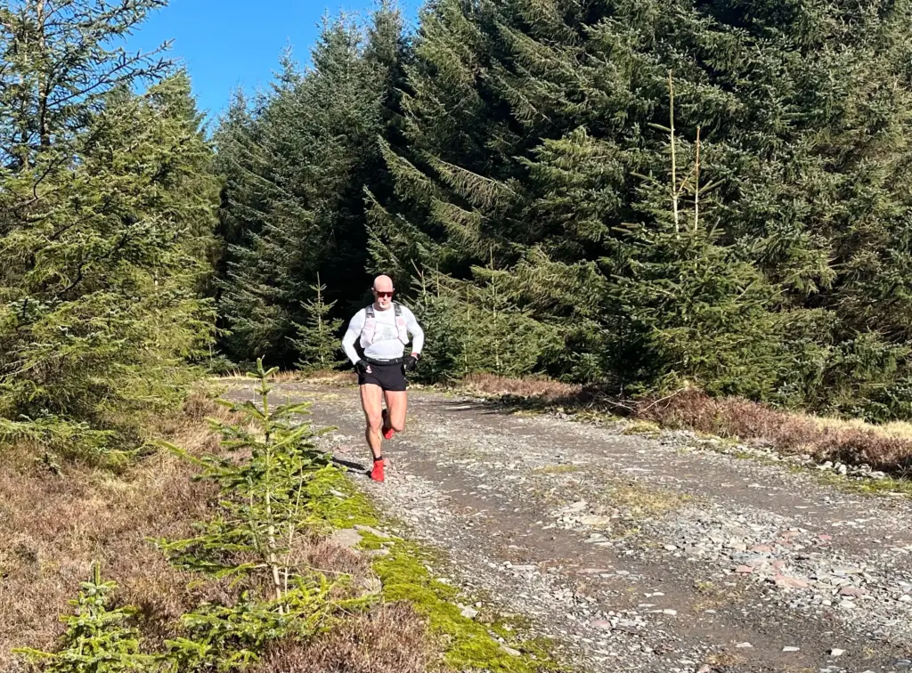 Finally, I reached the turning off point and headed off the forest track, into the trees and down a narrow heather covered path through the fire break. I was very much enjoying the running and the alertness it required given the terrain. The shoes I wore were light, streamlined and grippy, perfect for the conditions.