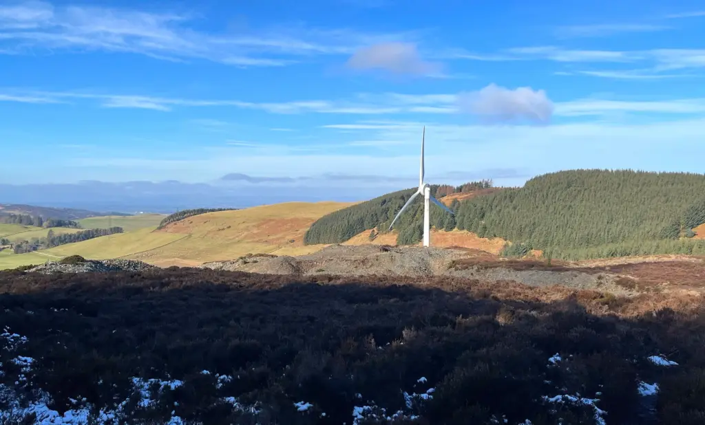 Eventually, a viewpoint is reached looking northwest over a wind turbine to the forest and hills beyond and with a faint glimpse of the top of the tower on Kinpurney Hill ahead.